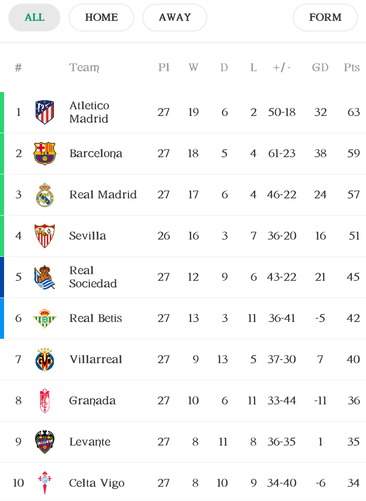 Scoreboard.com offers home/away/overall laliga 2020/2021 standings, form (last 5 matches), over/under and top scorers tables. Diego simeone speaks after atletico madrid withdrew their membership from the european super league. Complete table of la liga standings for the 2020/2021 season, plus access to tables from past seasons and other football leagues. (matches won, matches drawn, matches lost, goals scored, goals conceded). Leaders atletico madrid claim vital win, sevilla out of race.